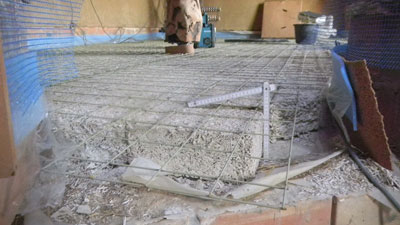 Rezanje prefabriciranih konopljinih zidakov pred vgradnjo (levo), uporaba zidakov kot talne izolacije v estrihu (desno), vir: ISOHEMP Belgija