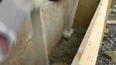 Prerez stene iz konopljinega betona – leseni stebri so zaščiteni pred insekti in vlago (levo), nabijanje materiala v opaže z lesenimi kladivi (desno)