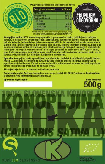 Konopljina moka 100% slovenskega porekla je polnovredna moka, pridobljena iz semen industrijske konoplje (Cannabis Sativa L) z mletjem briketov oz. pogače, ki nastane pri stiskanju konopljinih semen.