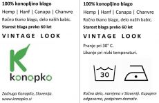 100% konopljino blago je ročno tkano, zato so vzorci različni, struktura blaga pa neenaka, a zelo čvrsta in pristna. Ramenske vrvi za nošenje so konopljine.