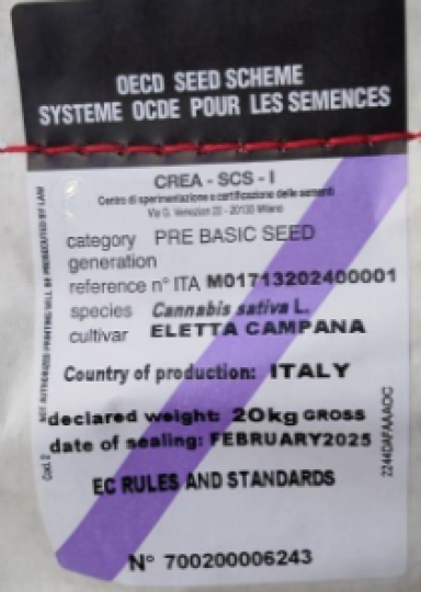 Certificirano seme industrijske konoplje (Cannabis sativa L) sorte ELETTA CAMPANA, vpisane v EU sortno listo. Sorta ELETTA CAMPANA je stara italijanska sorta, znana po velikem donosu biomase, visokem deležu CBD-ja in veliki listni masi.