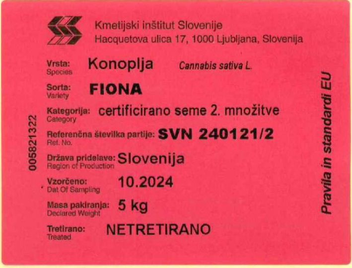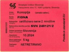 Certificirano seme industrijske konoplje (Cannabis sativa L) sorte FIONA, vpisane v EU sortno listo.