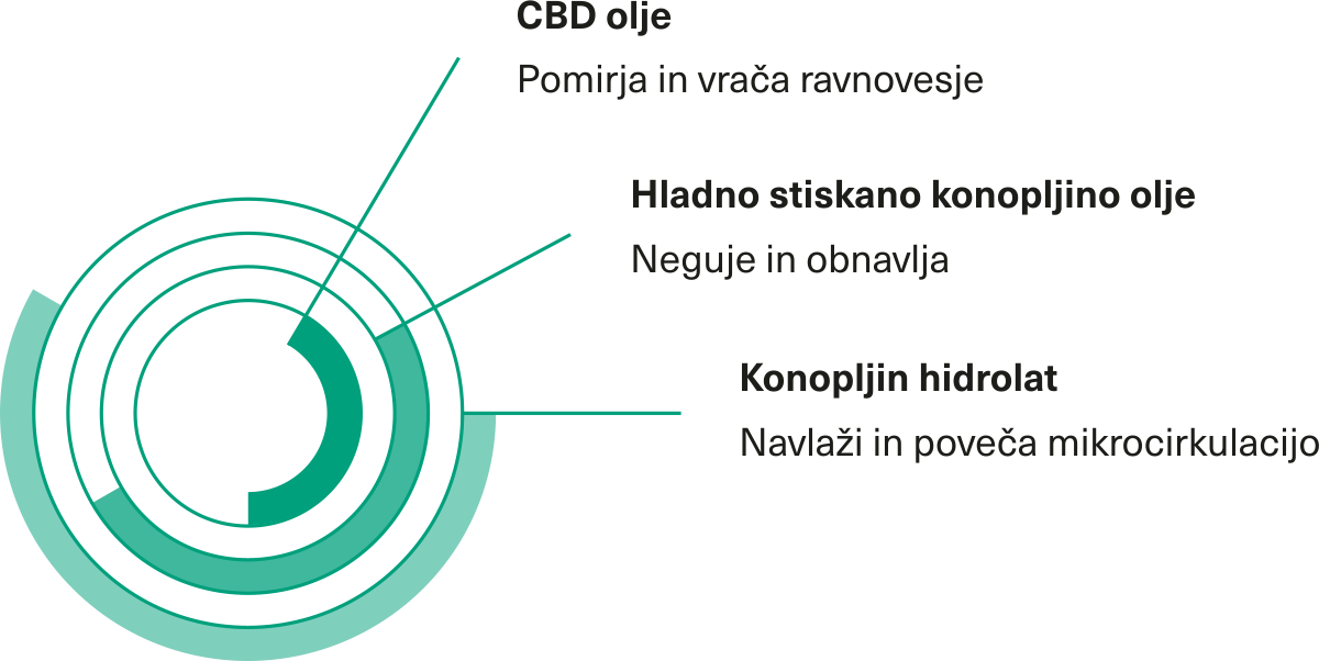Hladno stiskano konopljino olje vsebuje kombinacijo nenasičenih maščobnih kislin, proteinov, ogromno vitaminov, minerale in ogljikove hidrate. Vse te snovi predstavljajo popolno kombinacijo, katera zmanjšuje učinke staranja kože, vzdržuje njeno vlažnost in ob tem še povečuje njeno naravno zaščito.