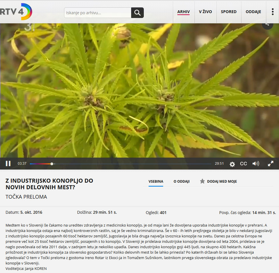 Medtem ko v Sloveniji še čakamo na ureditev zdravljenja z medicinsko konopljo, je od maja lani že dovoljena uporaba industrijske konoplje v prehrani. A industrijska konoplja ostaja ena najbolj kontroverznih rastlin, saj je še vedno kriminalizirana. Še v 60 - ih letih prejšnjega stoletja je bilo v nekdanji Jugoslaviji z industrijsko konopljo posajenih 60 tisoč hektarov zemljišč, Jugoslavija je bila druga največja izvoznica konoplje na svetu. Danes pa celotna Evropa ne premore več kot 25 tisoč hektarov zemljišč, posajenih s to konopljo. V Sloveniji je pridelava industrijske konoplje dovoljena od leta 2004, pridelava se je naglo povečevala od leta 2011 dalje, v zadnjem letu je nekoliko upadla. Danes industrijsko konopljo goji 445 ljudi, na skupno 430 hektarih.