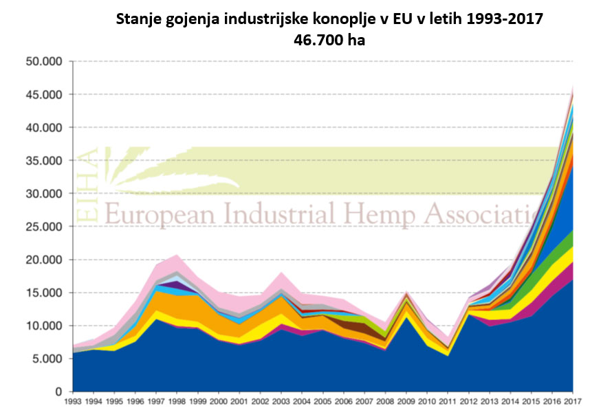 Diagram jasno kaže izjemno rast pridelave konoplje v EU državah in sicer vztrajno od 2014 dalje. Podatek je zanimiv, saj kaže na dejstvo, da so kljub enotnemu pravnemu okvirju znotraj EU nekatere države vseeno prepoznale potencial konoplje in spodbujajo panogo konopljarstva.